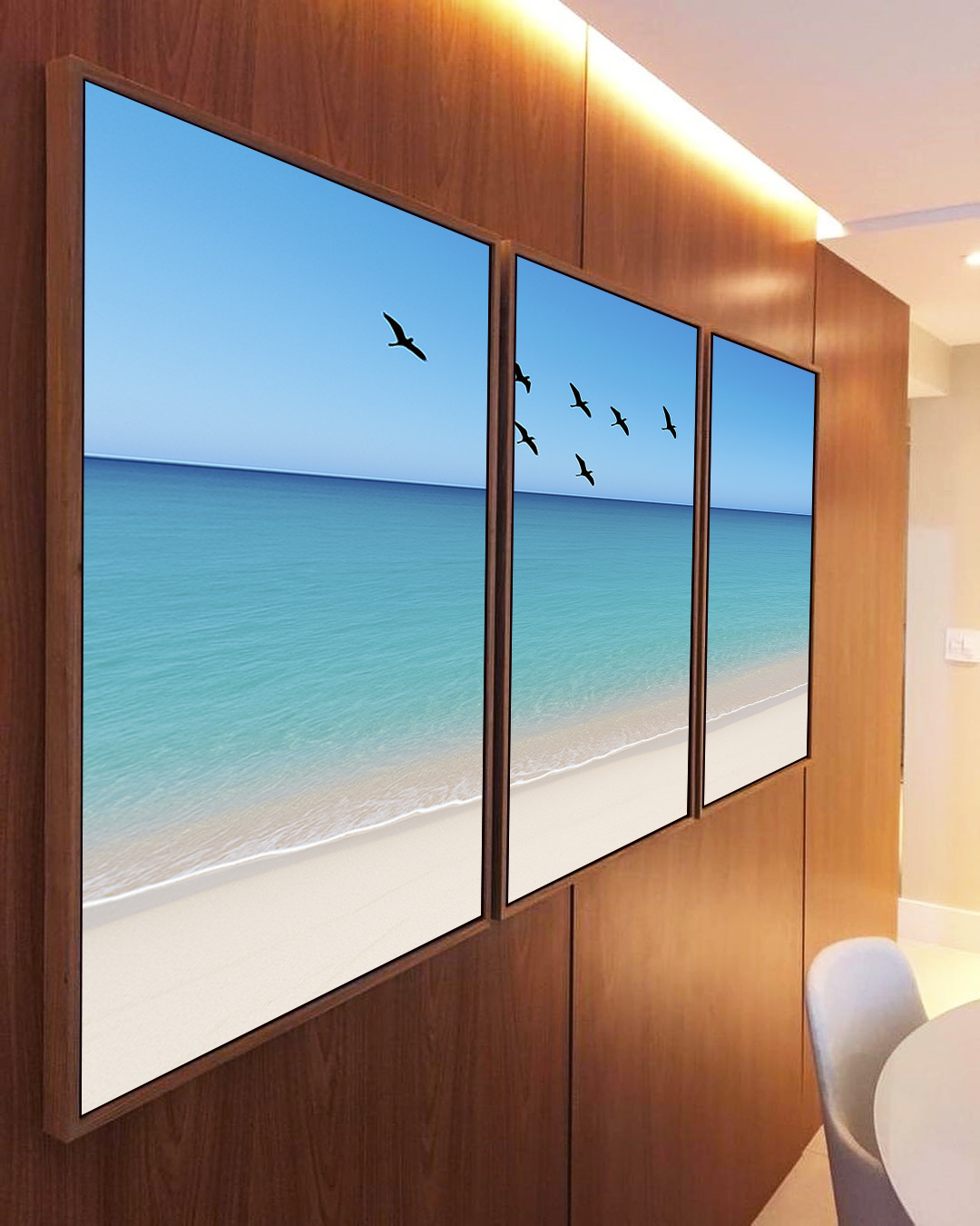 Com pássaros em movimento e tons suaves de azul e branco, este Trio de Quadros transmite paz e amplitude. Ideal para salas amplas, escritórios ou halls de entrada, ele transforma o ambiente com frescor, equilíbrio e sofisticação.