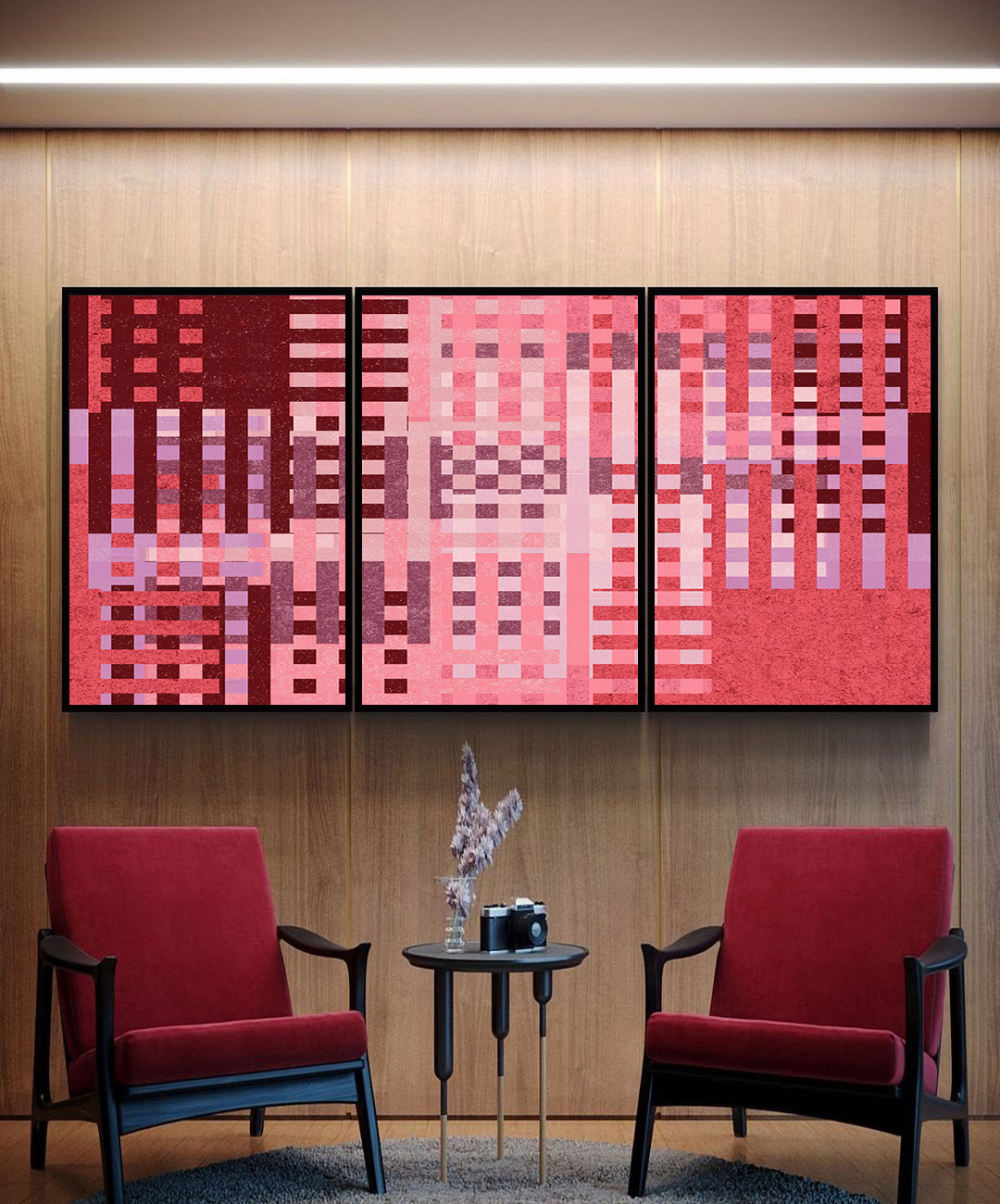 Este Trio de Quadros exibe um mosaico geométrico de tons quentes, do vinho ao rosa, criando profundidade e harmonia visual. É a escolha ideal para quem busca um toque de arte contemporânea em salas amplas, halls sofisticados ou escritórios elegantes.