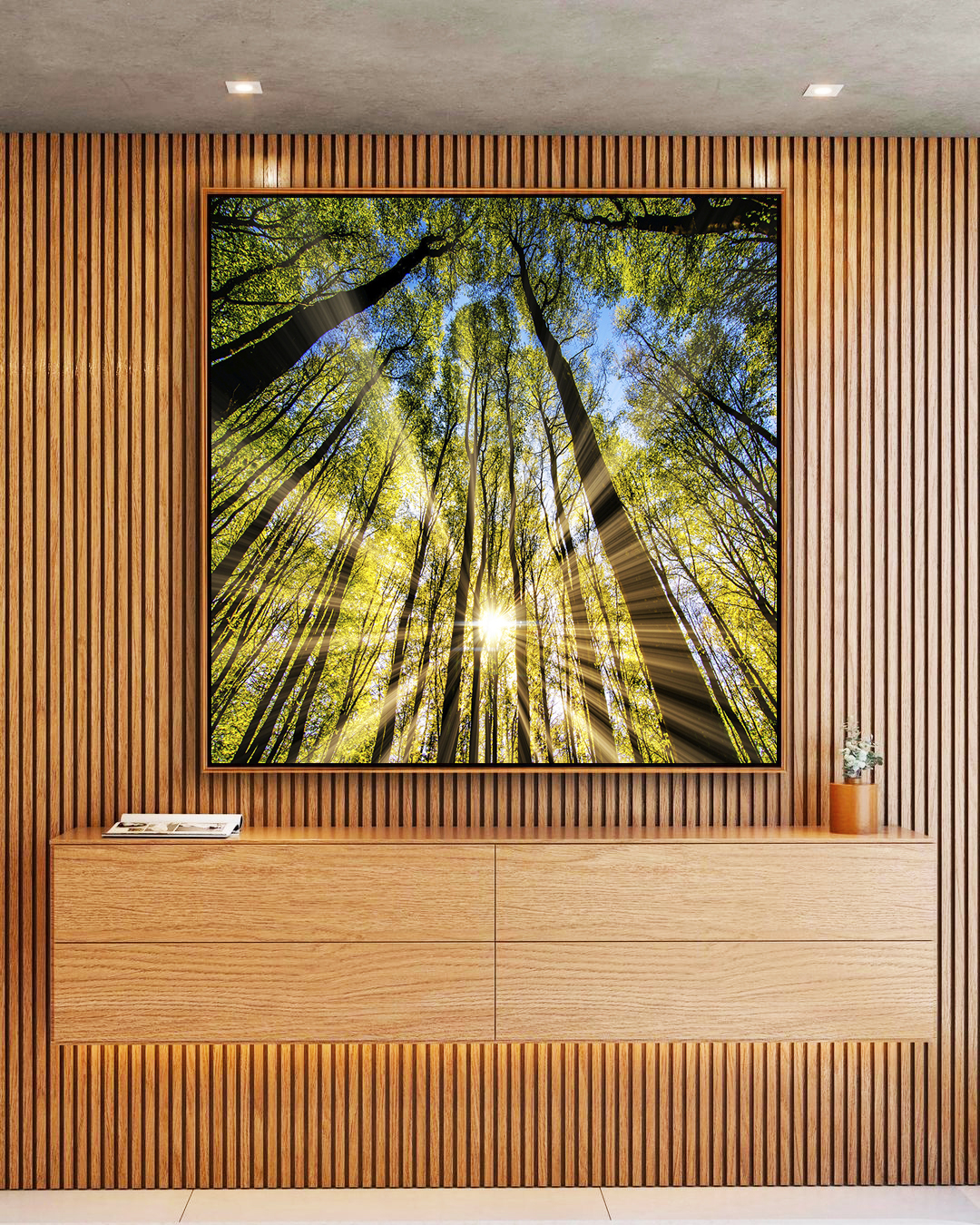 Quadro Quadrado que mostra floresta iluminada pelo sol com céu azul sereno. Com moldura extra fina flutuante, é ideal para salas, quartos ou escritórios, adicionando elegância, frescor e um toque de natureza sofisticada à decoração. Belíssimo!