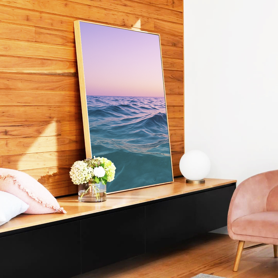 Com tons rosa, lilás e mar azul, este Quadro Vertical captura a beleza do amanhecer e traz harmonia à decoração.