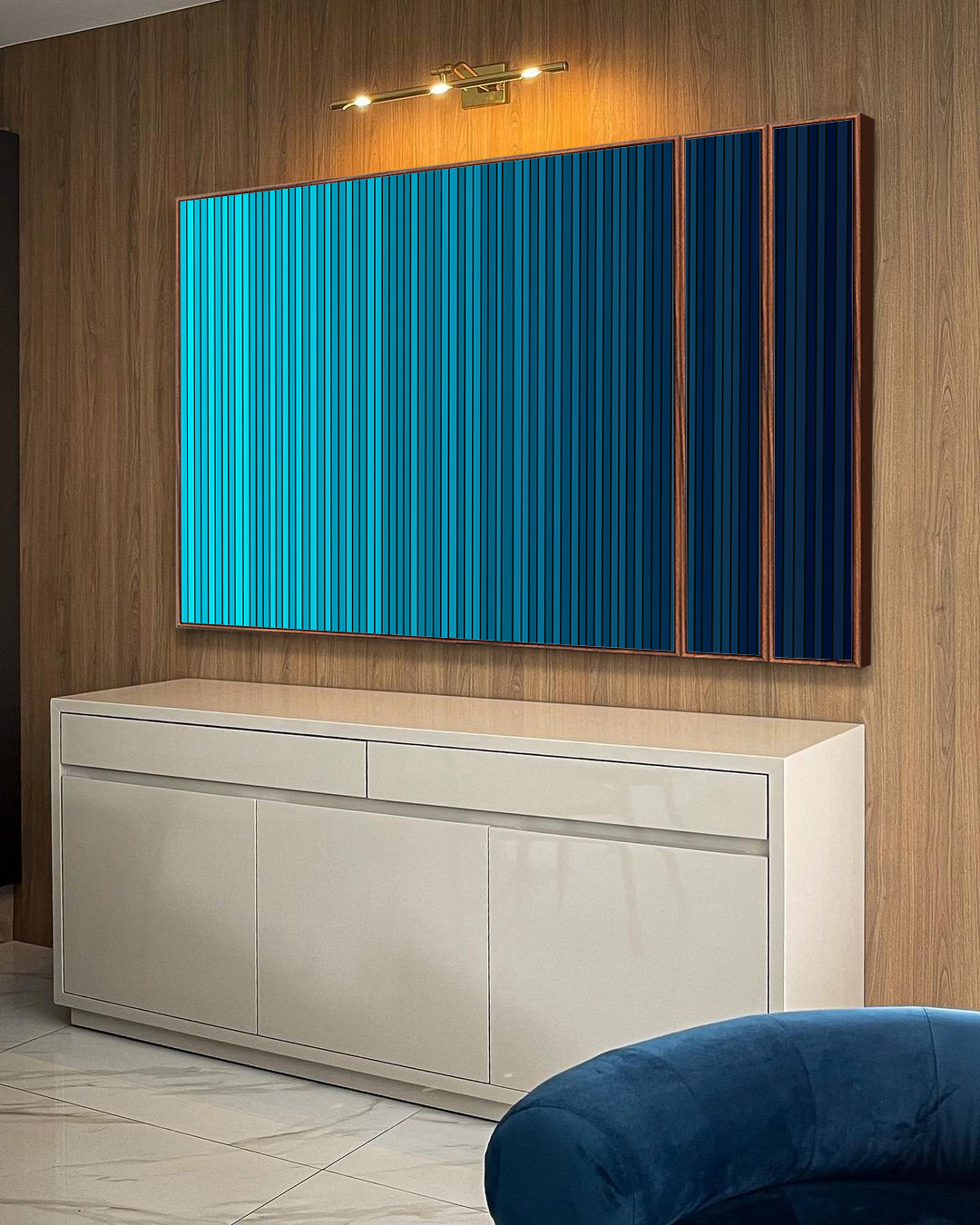 Sofisticado e atual, este Trio de Quadros Estilizados em azul degradê com listras abstratas cria um ponto focal elegante e equilibrado. Ideal para compor salas refinadas, quartos estilosos, escritórios contemporâneos ou halls de entrada imponentes.