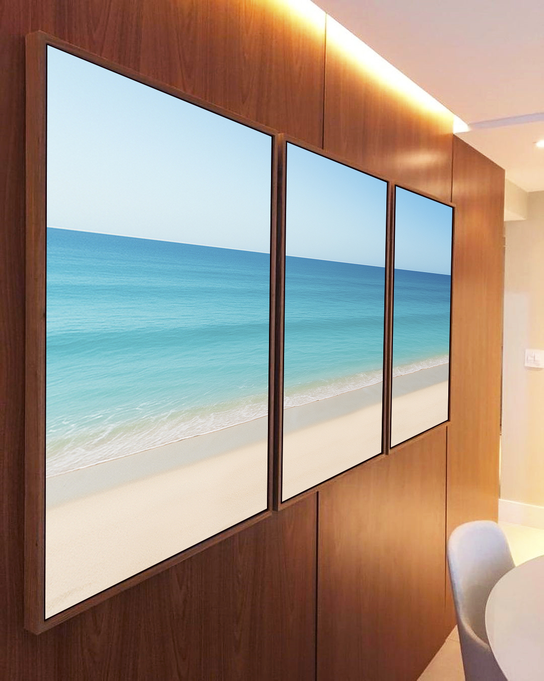 O mar azul e o céu límpido se unem neste Trio de Quadros para criar uma sensação de paz e amplitude. Perfeito para decorar sua sala, quarto ou escritório com leveza e elegância atemporal. Lindo e de grande harmonia visual.