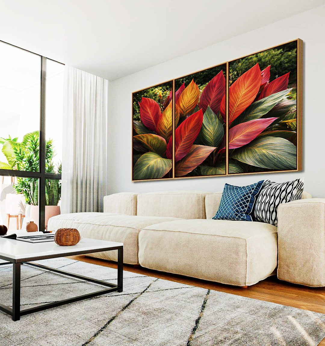Trio de Quadros Planta Cróton Colorida Folhagem Tropical Natureza Paisagem Canvas Moldura