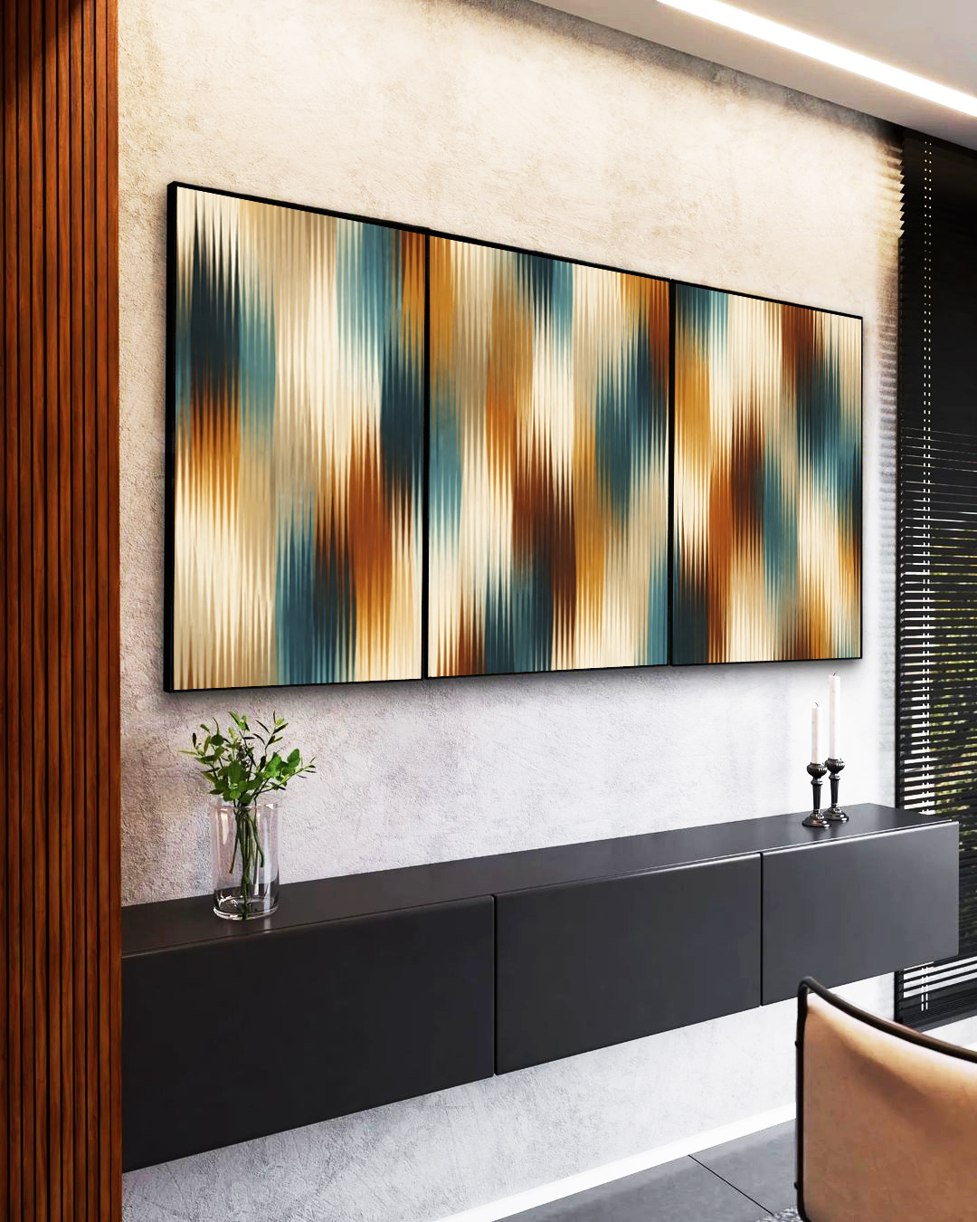 Sutil e envolvente, este Trio de Quadros com listras azul em degradê e nuance bronze transmite equilíbrio visual e requinte. A escolha certa para salas amplas, quartos elegantes, escritórios criativos ou halls de entrada marcantes.