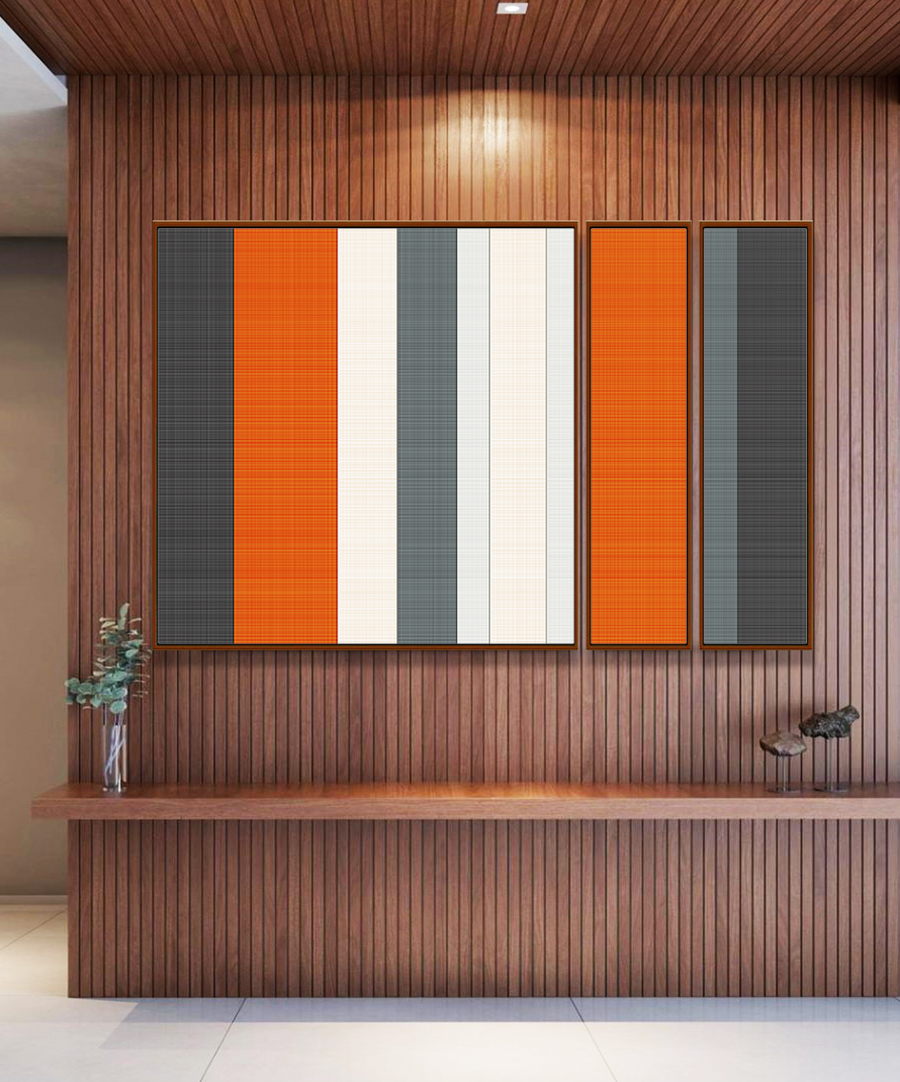 Este Trio de Quadros Estilizados abstrato combina listras em laranja, branco e cinza, criando uma composição moderna e sofisticada. A escolha ideal para valorizar salas de estar, quartos elegantes, escritórios contemporâneos bem iluminados.