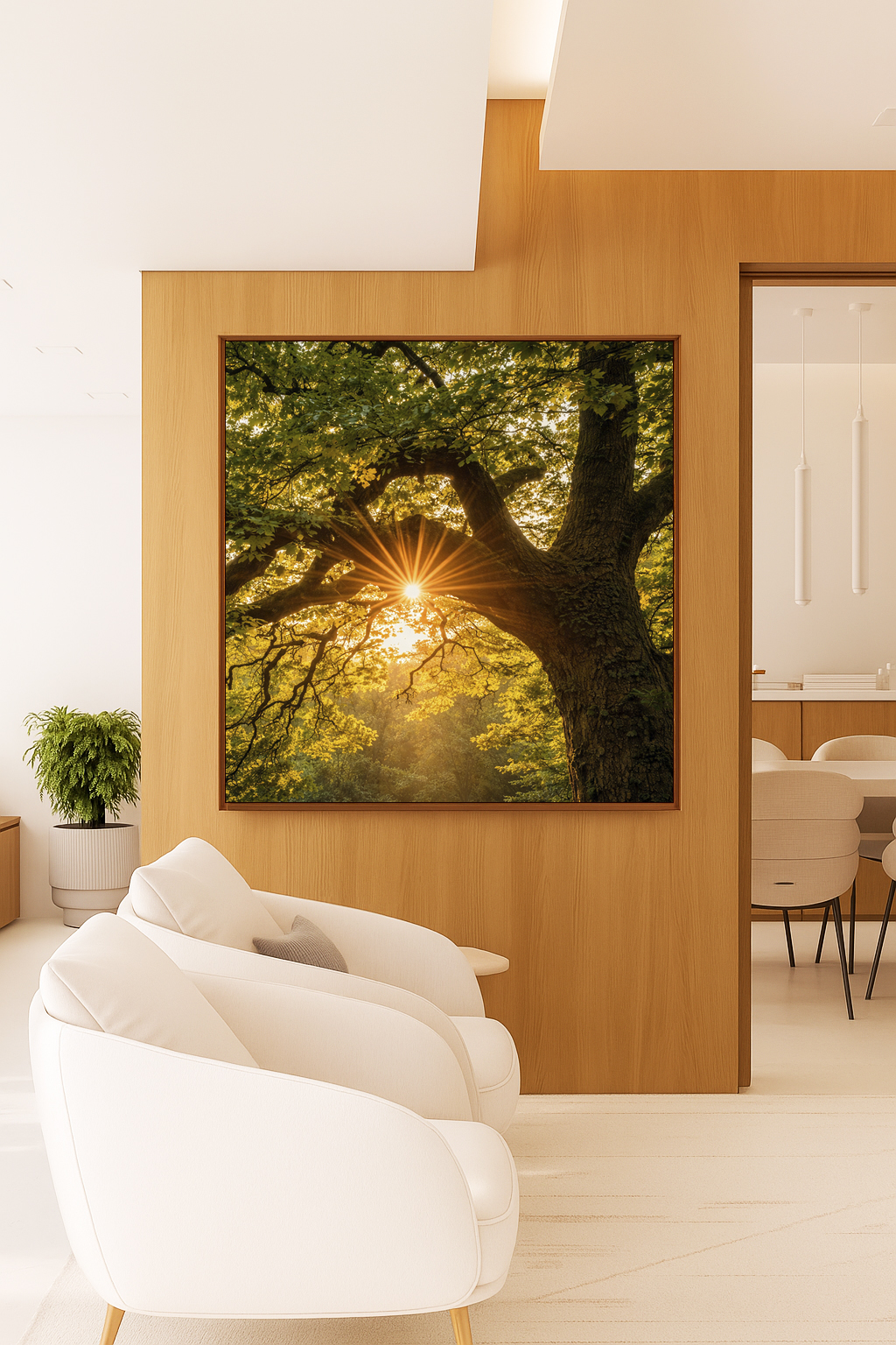 Uma paisagem de floresta iluminada pelo sol transmite serenidade e equilíbrio ao espaço. Perfeita para salas de estar, quartos, recepções e espaços de tranquilidade.