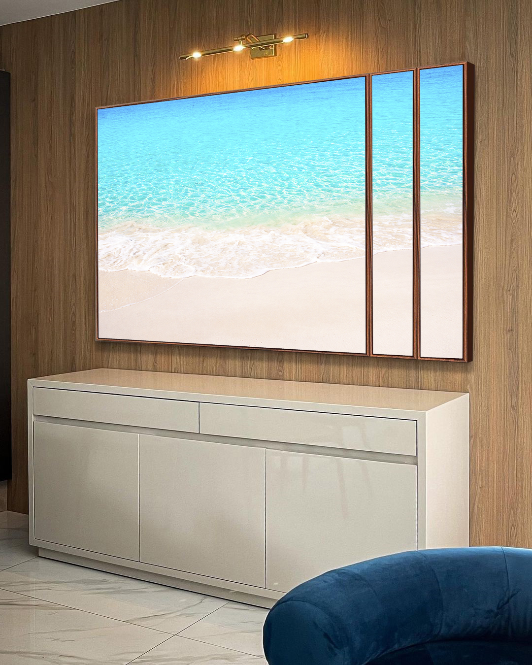 Trio de Quadros Estilizados Areia Branca Praia Azul Cristalino Canvas Moldura