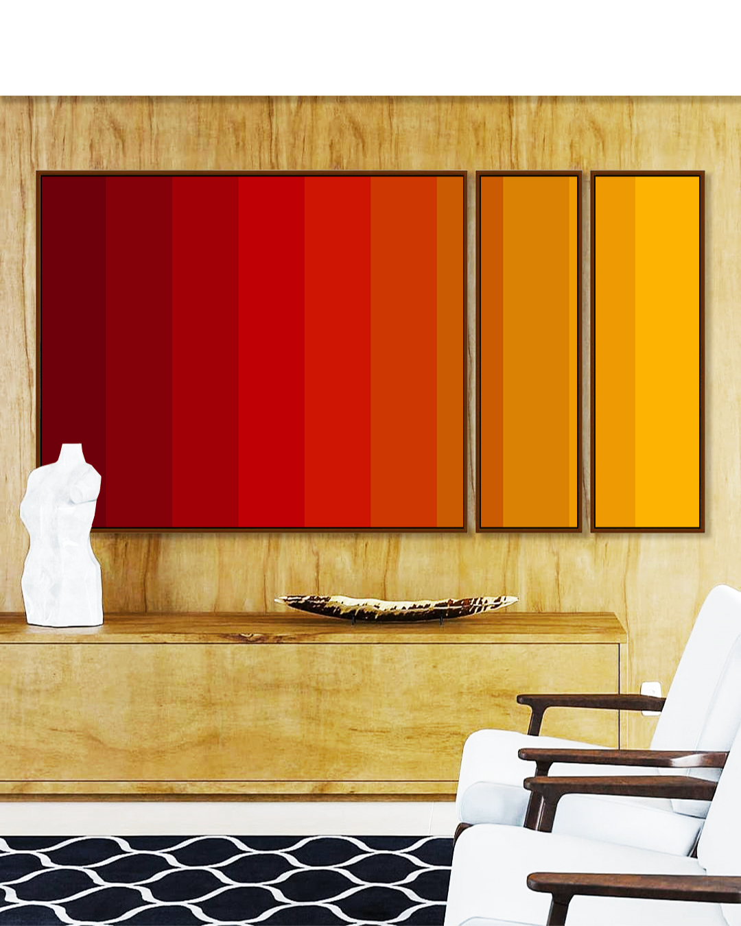 Moderno e envolvente, este Trio de Quadros Estilizados com cores quentes em degradê cria um ponto focal cheio de energia e estilo. Ideal para compor salas sofisticadas, quartos elegantes, escritórios criativos ou halls de entrada de destaque.