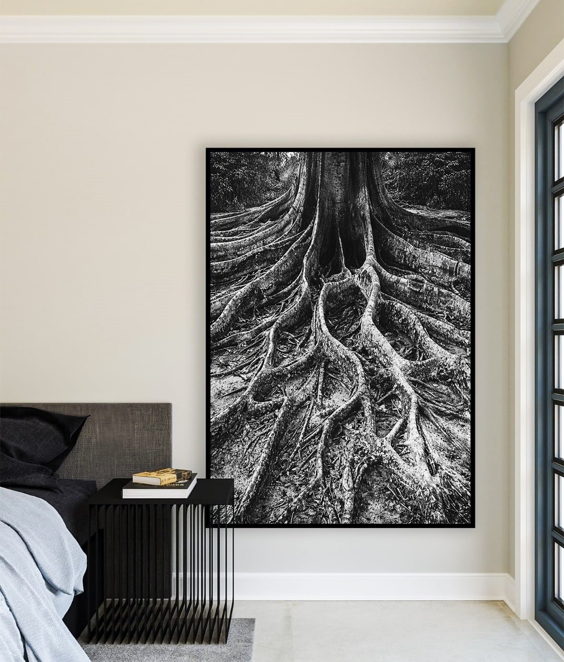 Raízes profundas de árvore em preto e branco criam impacto visual, destacando linhas orgânicas, natureza e textura natural. Estilo elegante e contemporâneo que harmoniza com decorações modernas. Ótima escolha para salas, escritórios e recepções.
