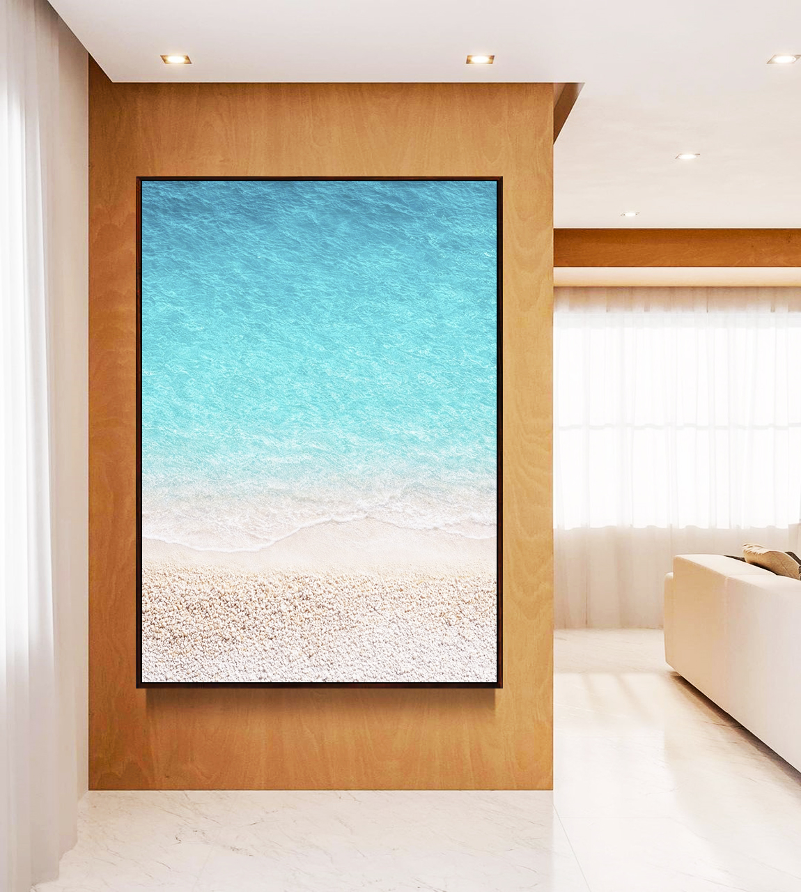 Natural e marcante, este Quadro Vertical de praia com areia branca e mar azul turquesa cria ponto focal sofisticado e sensação de refúgio no ambiente. Ideal para compor salas modernas, quartos elegantes ou halls de entrada de destaque.