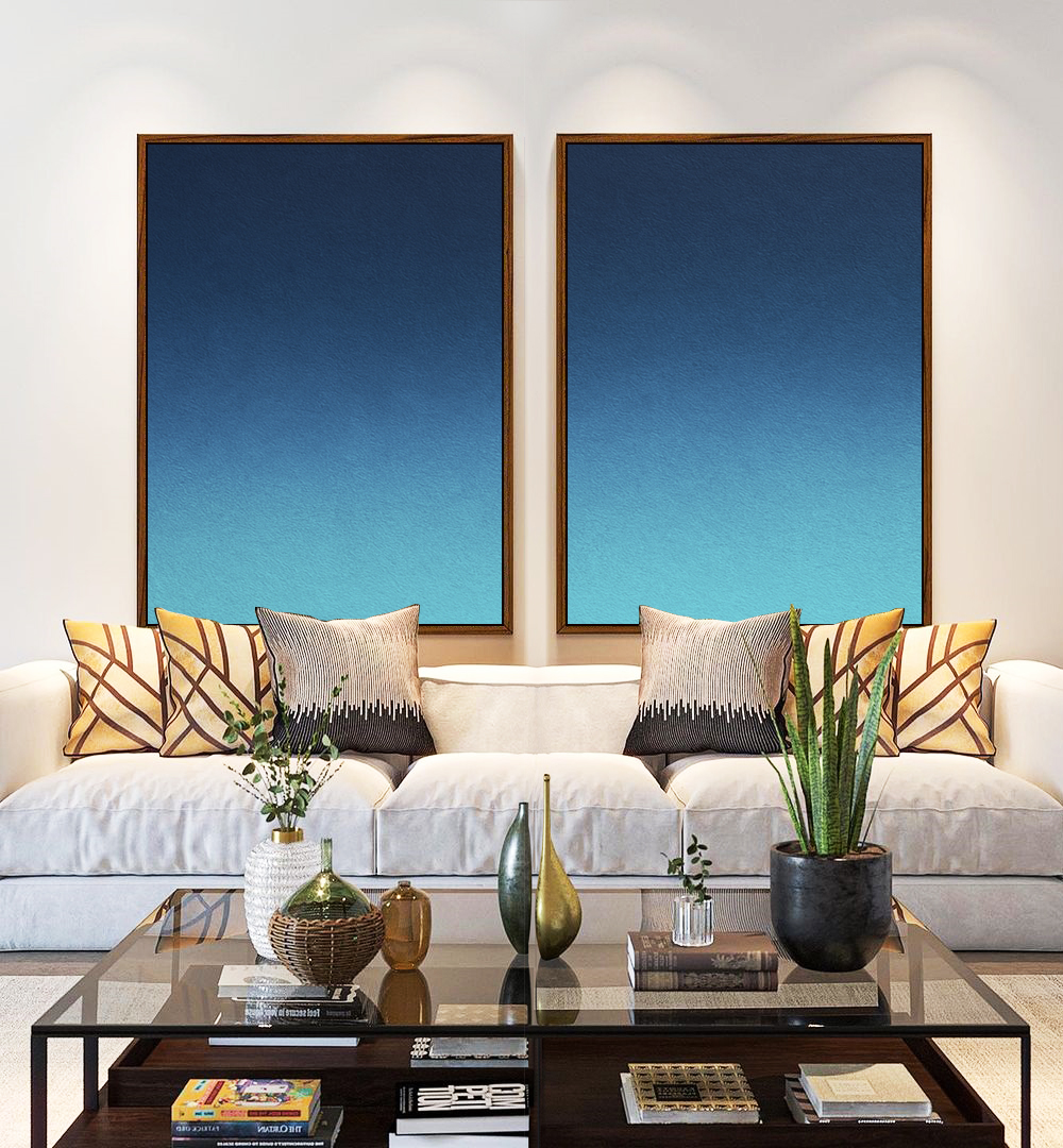 Elegante e envolvente, este Duo de Quadros com degradê em tons de azul apresenta textura delicada e visual equilibrado. Ideal para valorizar salas modernas, quartos elegantes, escritórios profissionais ou halls de entrada bem iluminados.