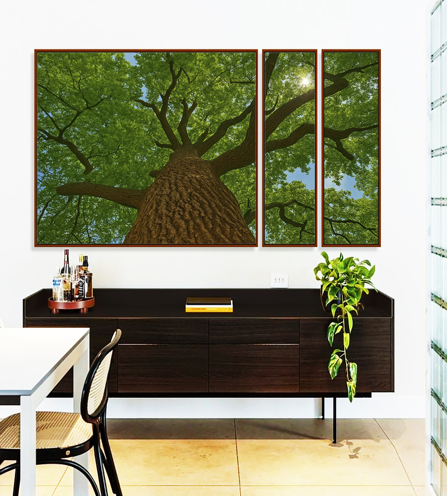Sereno e sofisticado, este Trio de Quadros Estilizados retrata a beleza da Natureza com folhas verdes e árvore em destaque, criando sensação de equilíbrio visual. Ideal para valorizar salas refinadas, quartos elegantes ou halls de entrada marcantes.