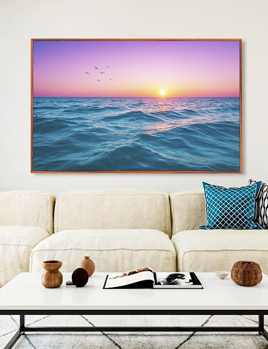Delicado e envolvente, este Quadro Horizontal com mar azul ondulado e céu em tom rosado cria uma atmosfera suave e sofisticada. A escolha ideal para salas elegantes, quartos acolhedores, escritórios modernos ou halls de entrada marcantes.