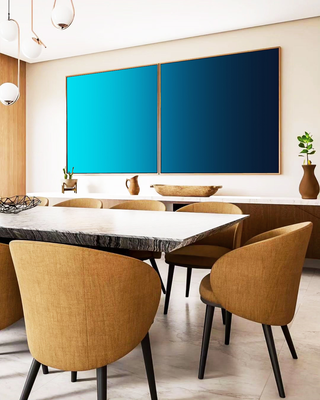 Com transição suave entre tons de azul celeste e marinho, este Duo de Quadros Quadrados cria sensação de equilíbrio e serenidade. Ideal para valorizar salas de estar, quartos refinados, escritórios profissionais ou halls de entrada bem planejados.