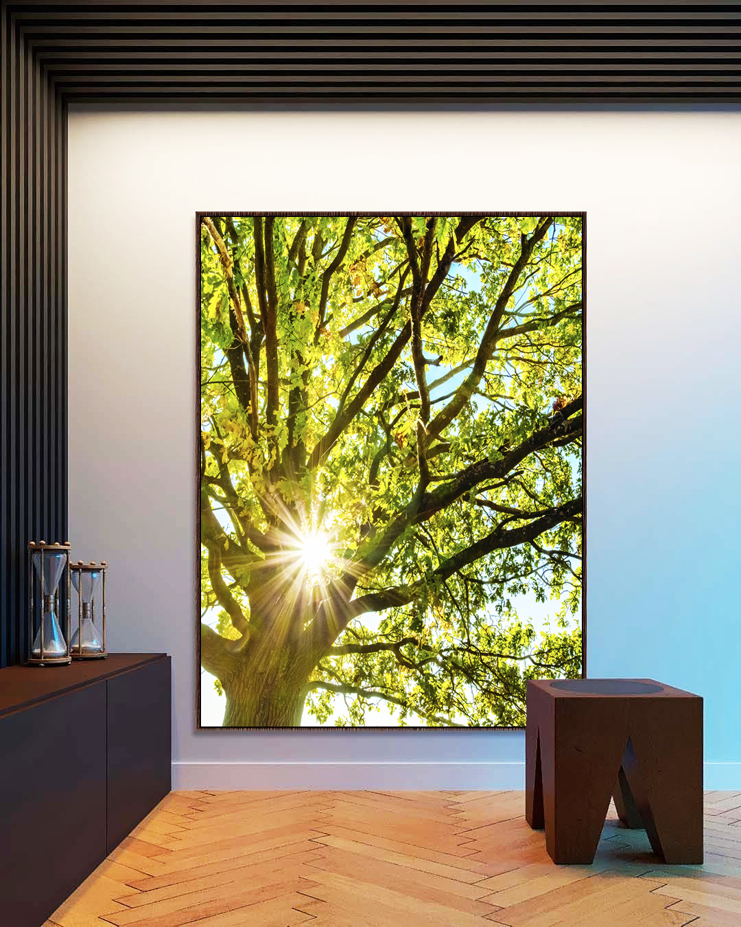 A beleza das folhas verdes iluminadas pelo sol dá a este Quadro Vertical uma sensação de calma e renovação. Ideal para decorar sua sala de estar, quarto ou hall de entrada, criando um espaço leve e cheio de energia positiva.