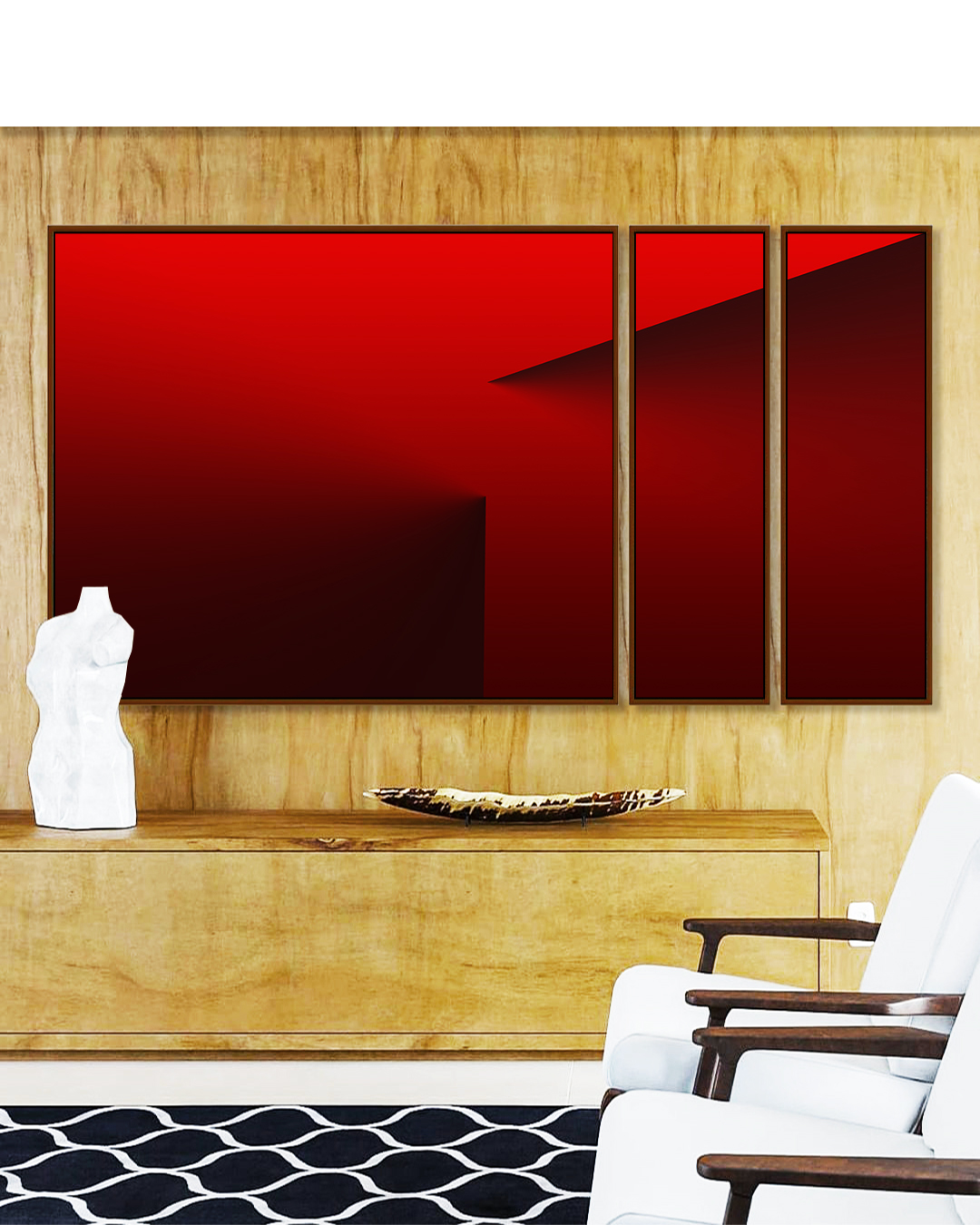 O degradê abstrato em vermelho confere intensidade, movimento e sofisticação ao Trio de Quadros Estilizados. Ideal para decorar salas de estar, quartos elegantes ou halls de entrada, criando uma atmosfera acolhedora e visualmente impactante.