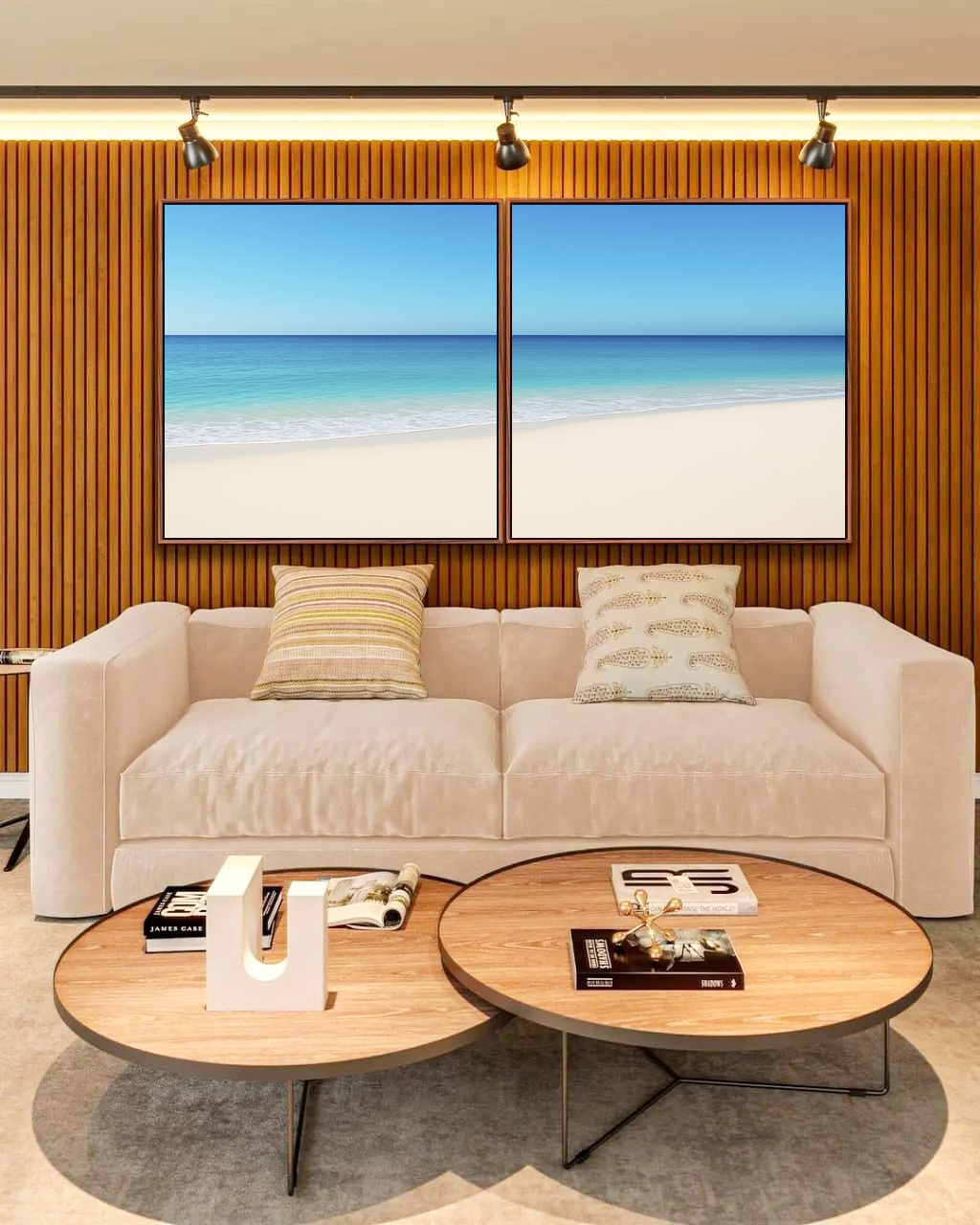 Com tons suaves de azul e a serenidade do mar calmo, este Duo de Quadros Quadrados transmite paz e leveza à decoração.