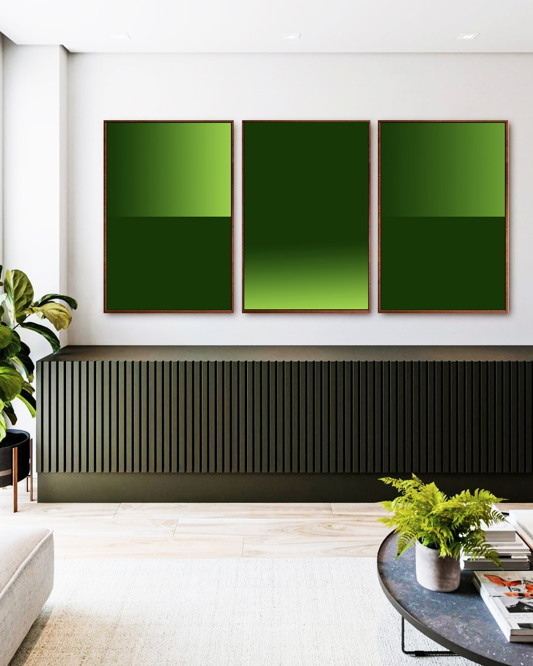 Trio de Quadros Abstrato Degradê Geométrico Verde Limão Canvas Moldura