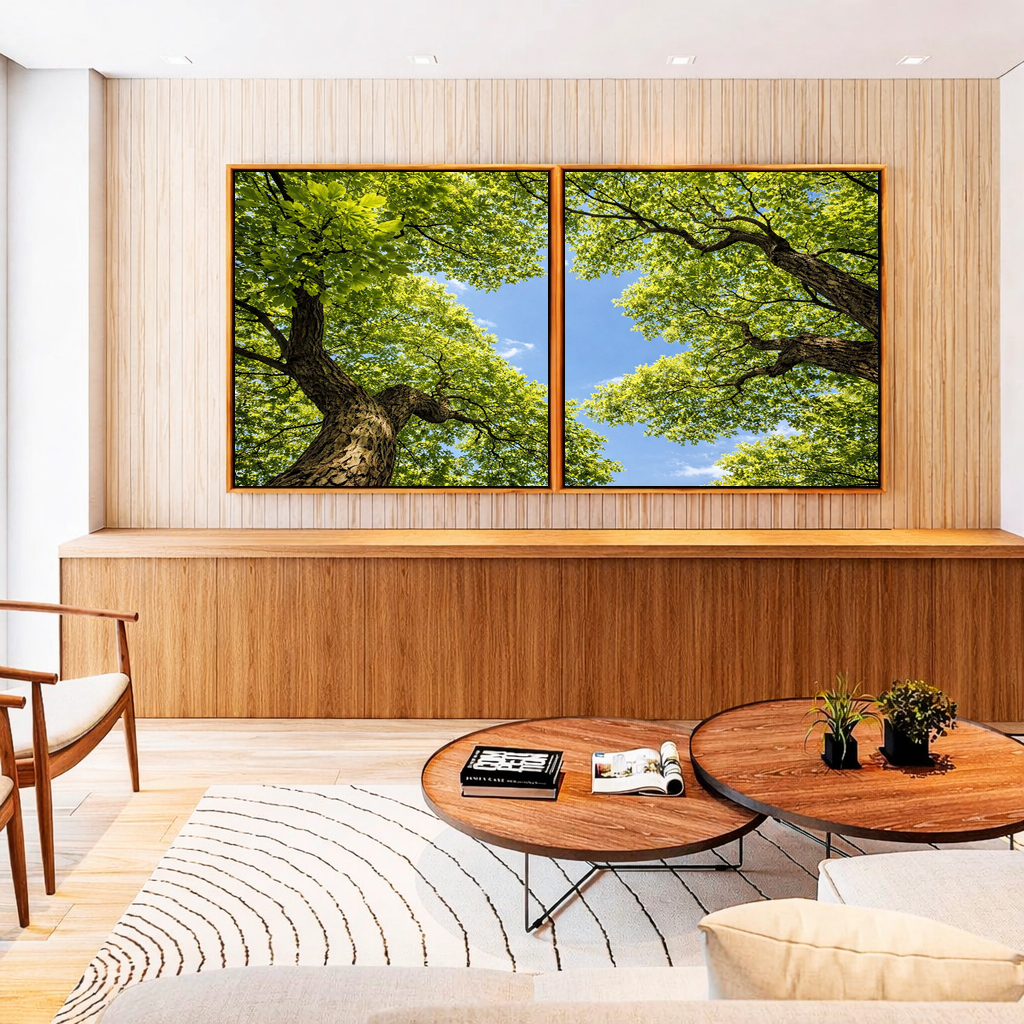 Árvores com folhagem verde sob um céu limpo criam uma atmosfera fresca e acolhedora. Ideal para salas, quartos e ambientes que buscam leveza, bem-estar e conexão natural no dia a dia.