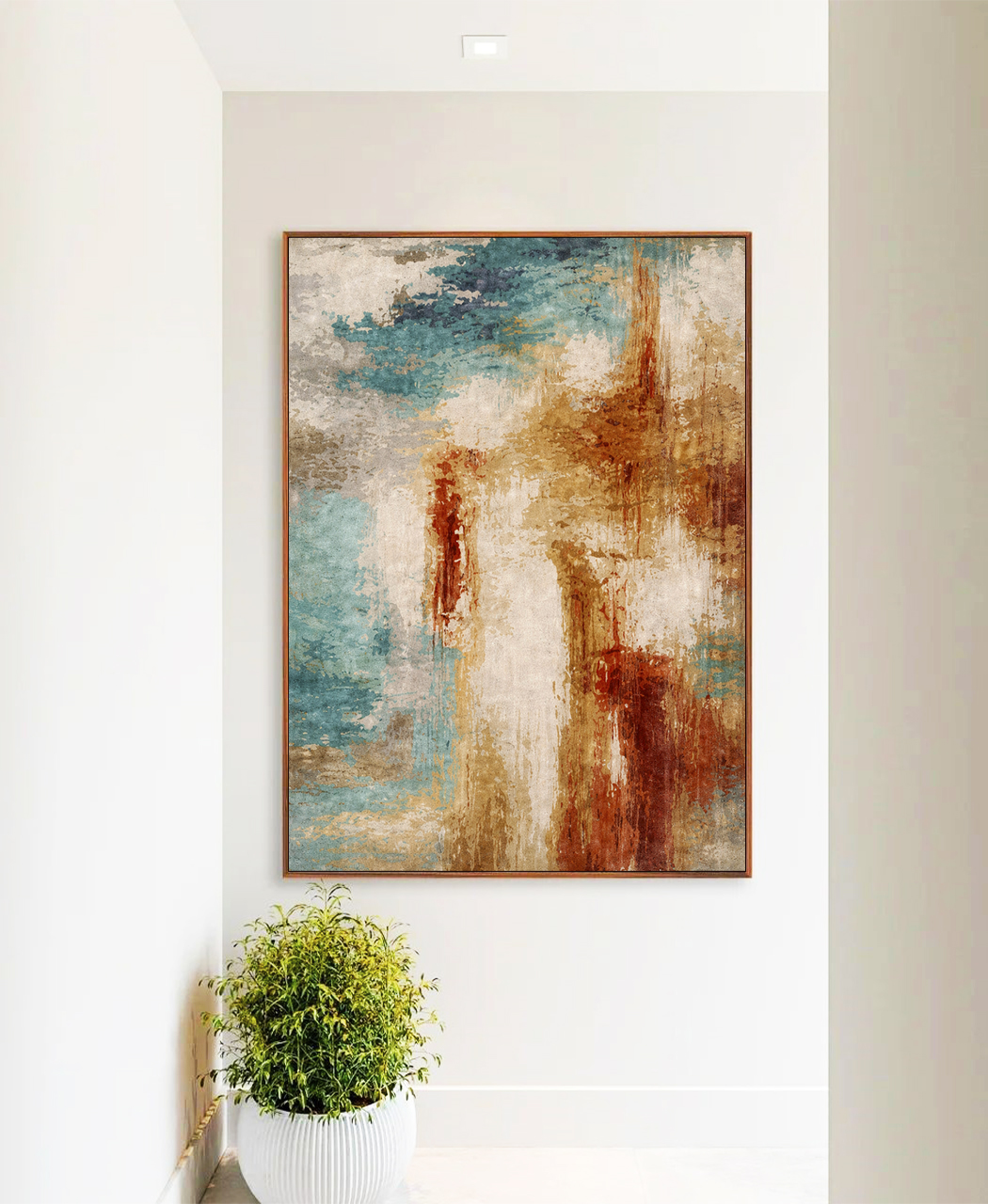 Textura marcante com azul, cobre e marfim que transmite sofisticação e estilo artístico. Uma escolha versátil para salas, dormitórios, ambientes corporativos e projetos de decoração atual.