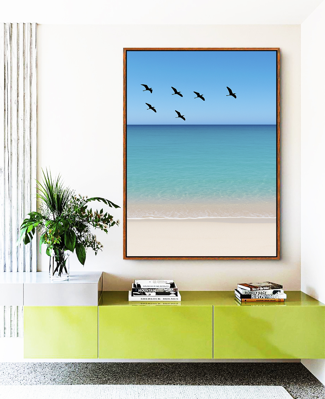 Quadro Vertical Pássaros em Céu Claro Mar Azul Praia Branca Canvas Moldura