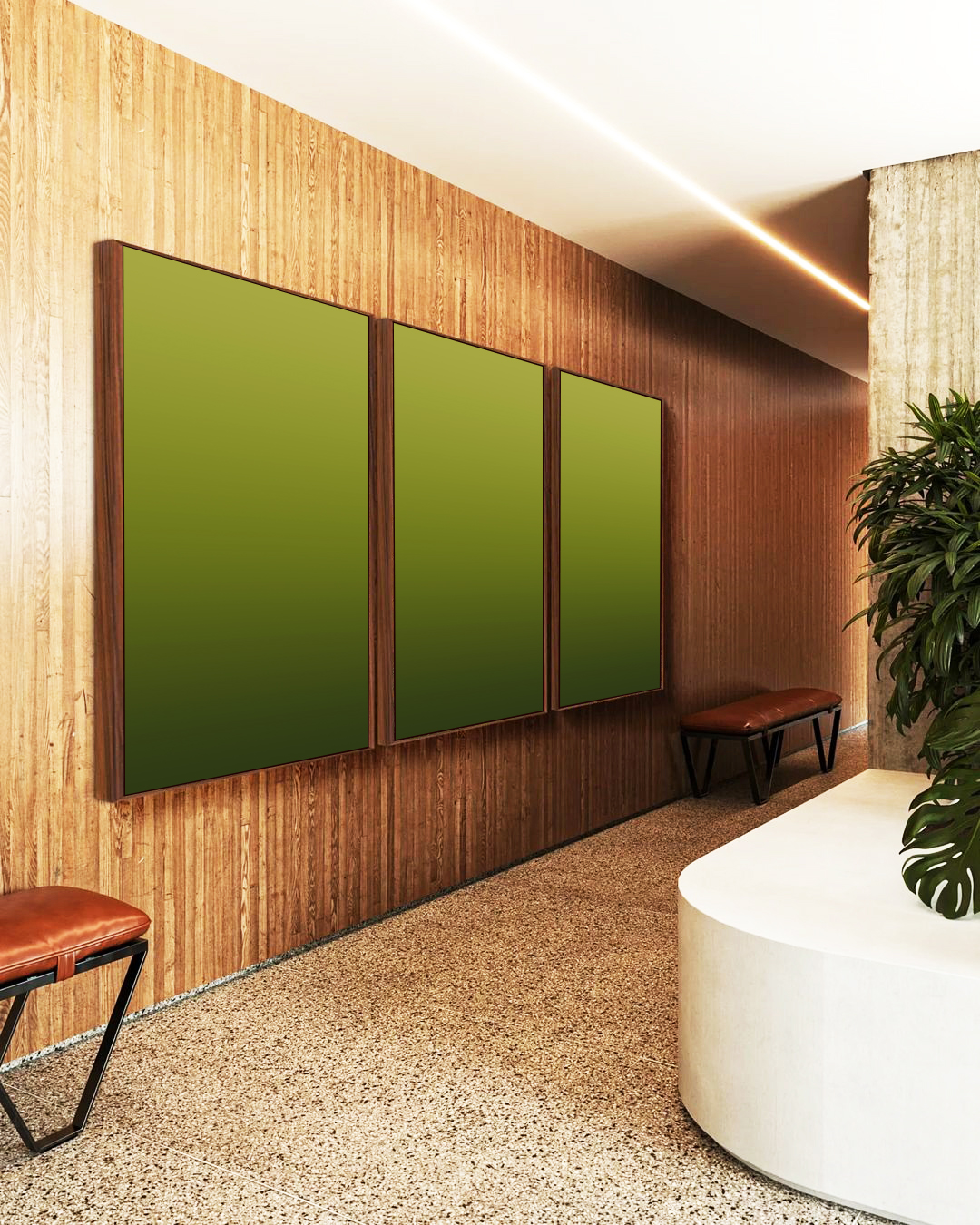 Sofisticado e contemporâneo, este Trio de Quadros com degradê em verde oliva transmite calma e requinte ao ambiente. Ideal para valorizar salas modernas, quartos aconchegantes, escritórios elegantes ou halls de entrada bem iluminados.