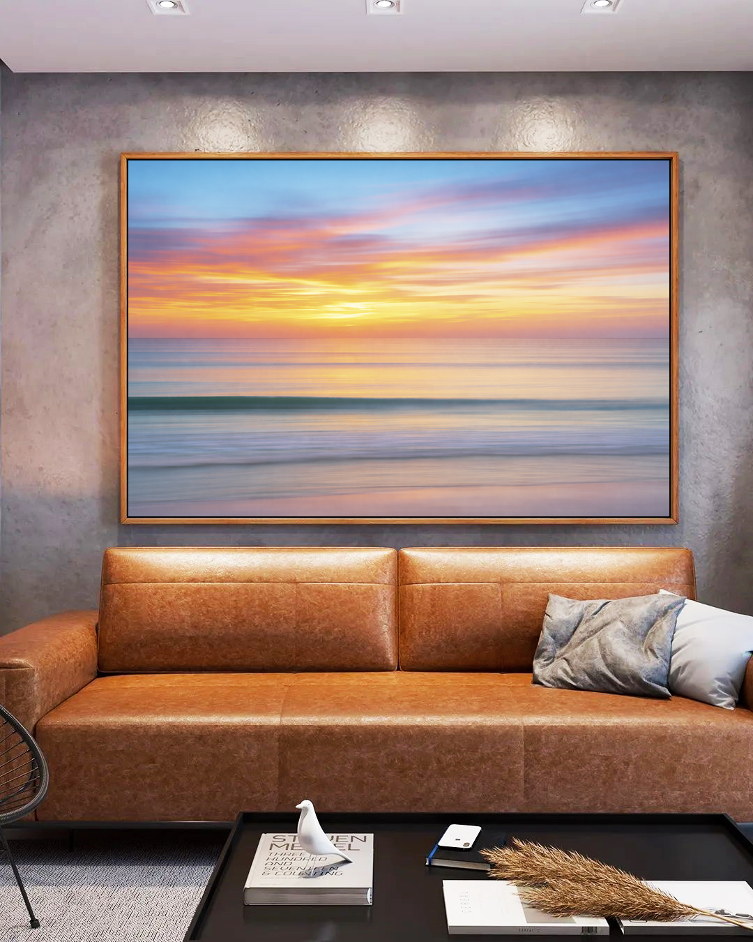 O mar em tons prateados encontra o céu em nuances de laranja e azul, criando uma atmosfera fluida e envolvente. Ideal para salas, quartos e ambientes que buscam leveza, movimento e bem-estar.