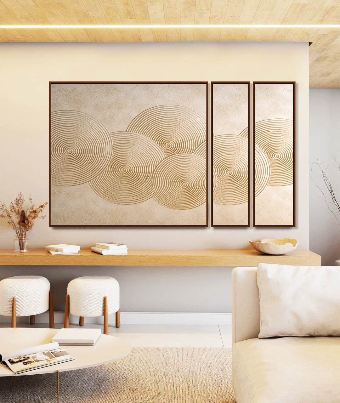 Sofisticado e atemporal, este Trio de Quadros Estilizados em tons de marfim com círculos abstratos adiciona leveza e requinte à decoração. A escolha ideal para salas amplas, quartos contemporâneos ou halls de entrada marcantes.