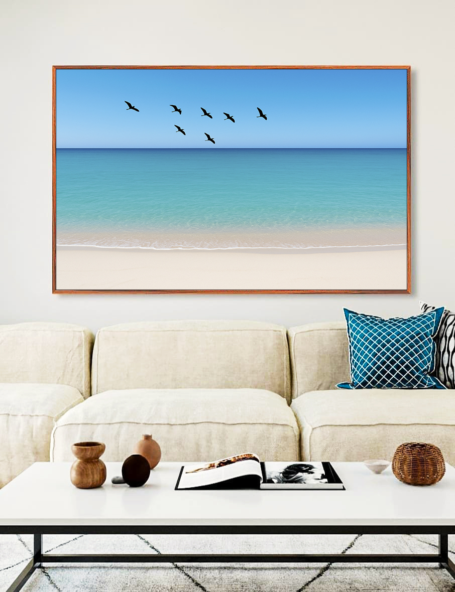 Com pássaros em movimento e tons suaves de azul e branco, este Quadro Horizontal transmite paz e amplitude. Ideal para salas amplas, escritórios ou halls de entrada, ele transforma o ambiente com frescor, equilíbrio e sofisticação.
