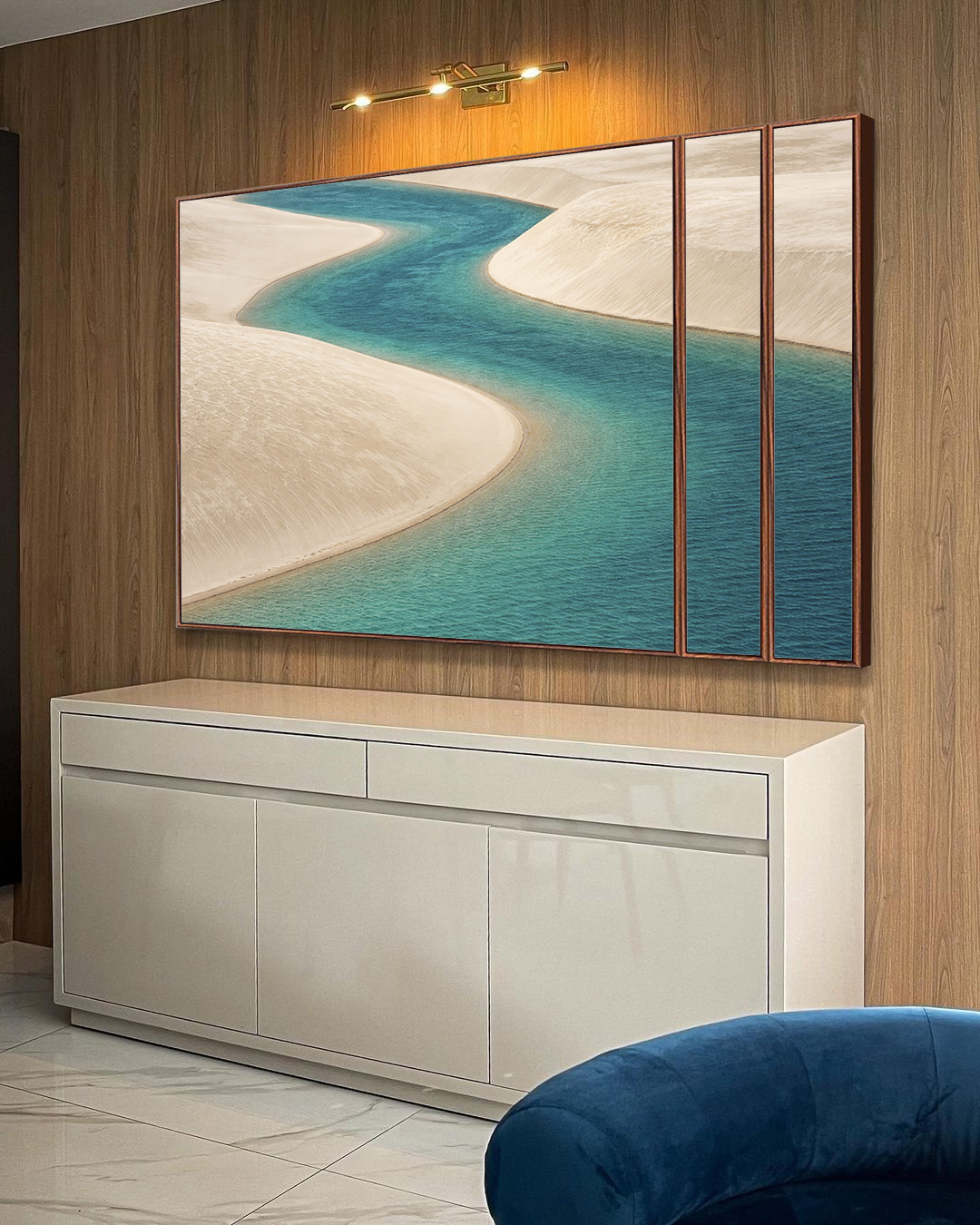 Mar azul com dunas de areia branca criando um cenário leve e paradisíaco. Tons claros e naturais trazem sensação de calma e frescor. Perfeito para salas e quartos, valorizando ambientes relaxantes, iluminados e com estilo praiano moderno.