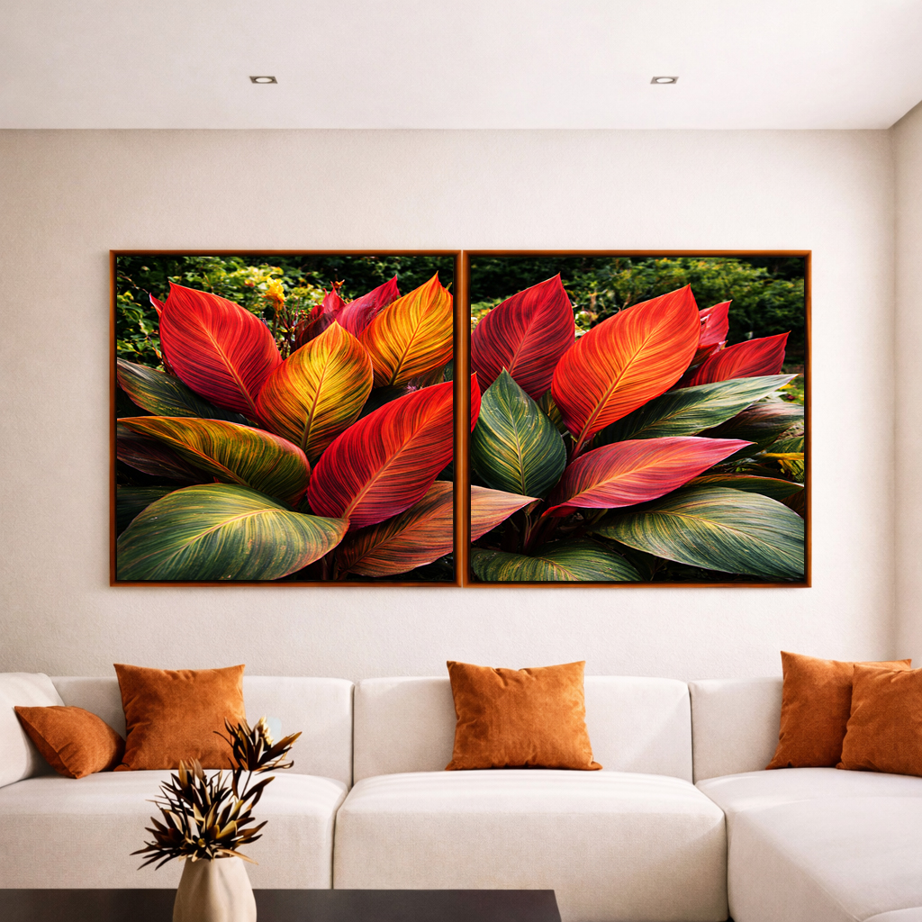 Folhagem tropical de cróton com folhas vibrantes em tons de vermelho, amarelo, laranja e verde. Natureza exuberante que traz energia, cor e frescor à decoração. Destaque visual para salas, escritórios e ambientes contemporâneos.