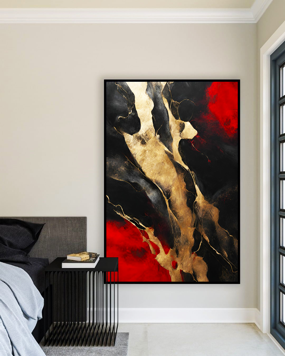 Valorize seu espaço com esta arte abstrata moderna em vermelho, preto e dourado. Perfeita para ambientes sofisticados como salas, escritórios ou corredores. Impressão premium sobre tela canvas, com moldura de acabamento refinado.