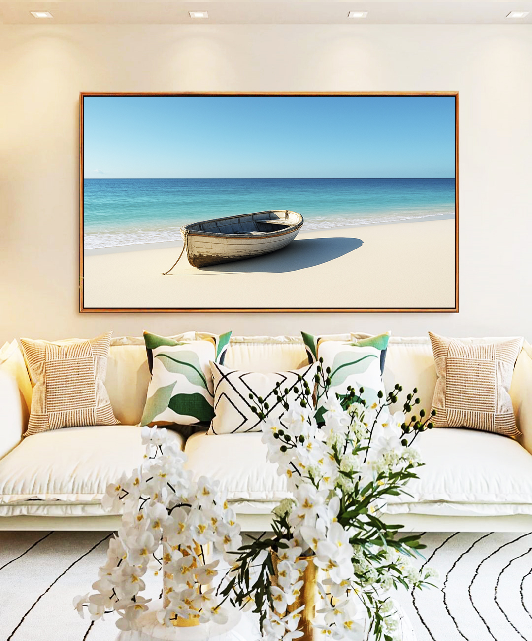 O equilíbrio entre o mar azul e o céu claro cria uma atmosfera relaxante. O Barco na praia torna este Quadro Horizontal Artístico. Uma escolha sofisticada para quem deseja um toque de frescor e serenidade em salas, quartos ou escritórios.