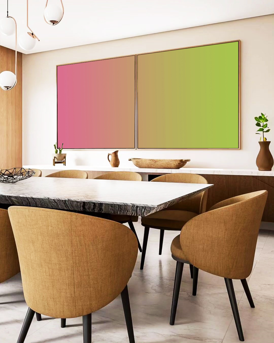 Tons suaves de rosa e verde em degradê artístico criam sensação de calma, harmonia e modernidade. Ideal para decorar sala de estar, quarto, escritório ou hall. Combina com decoração contemporânea, escandinava, minimalista e elegante.