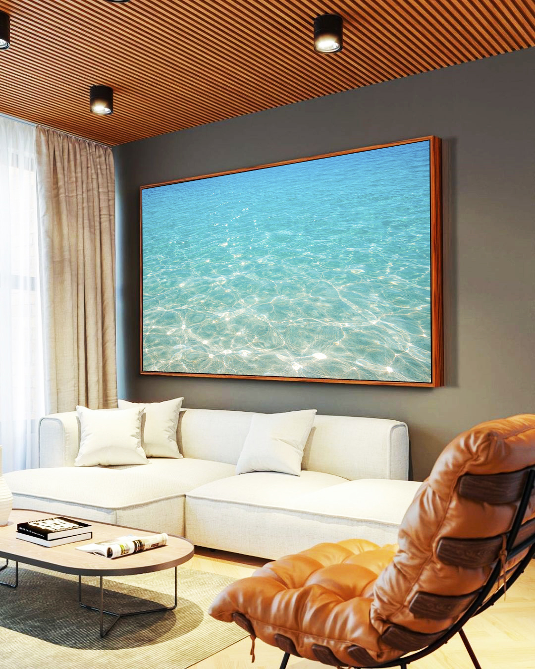 Mar azul cristalino com reflexos do sol, água transparente e sensação de frescor. Ideal para sala, quarto, escritório, hall ou ambientes de praia. Decoração leve, relaxante e natural, perfeita para trazer paz, luz e clima litorâneo ao espaço.