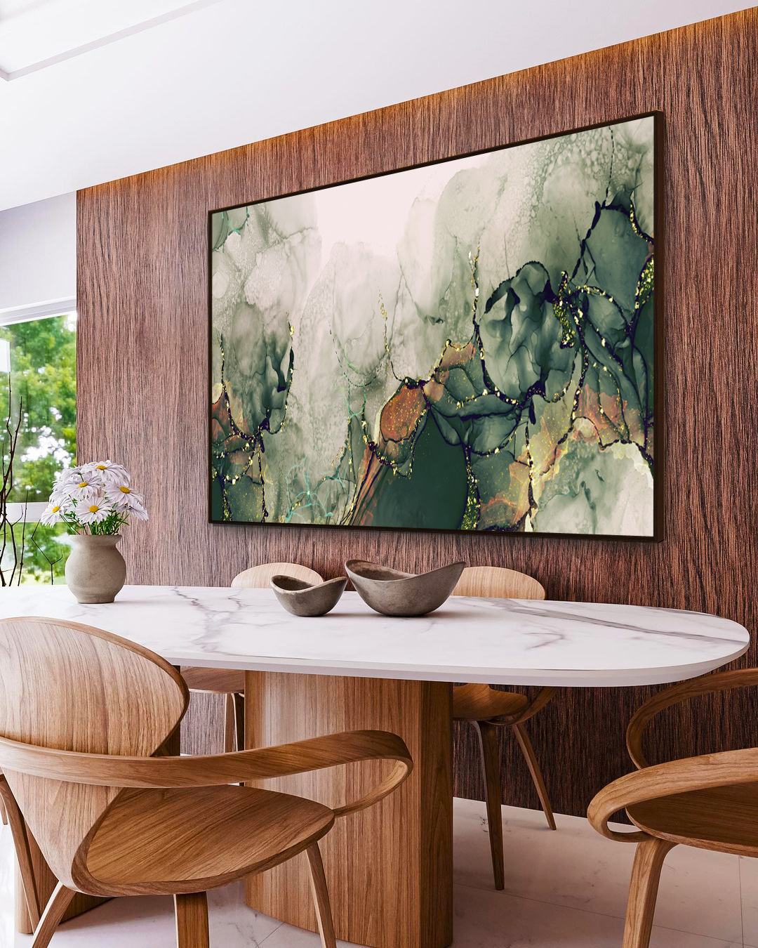 Quadro horizontal com design abstrato fluído em tons verde e cobre. Elegante e moderno, é ideal para decorar salas de estar, escritórios ou quartos. Impressão em canvas de alta qualidade e moldura refinada para um ambiente com mais estilo e harmonia.