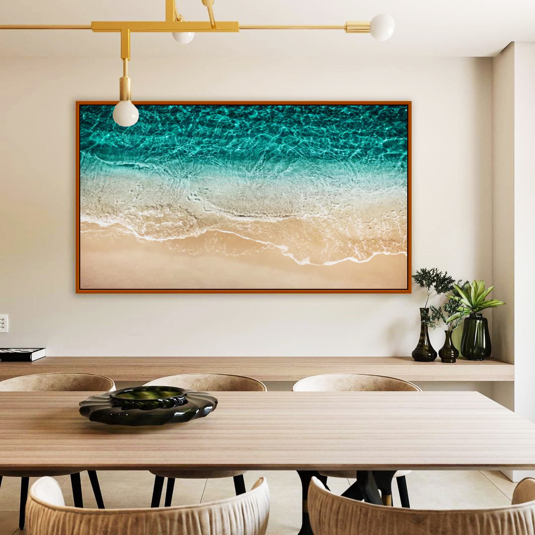 Quadro horizontal com mar de águas turquesa e areia clara. Ideal para salas de estar, escritórios ou quartos com decoração relaxante e natural. Impressão em canvas premium com moldura de qualidade, perfeito para criar um ambiente tranquilo.