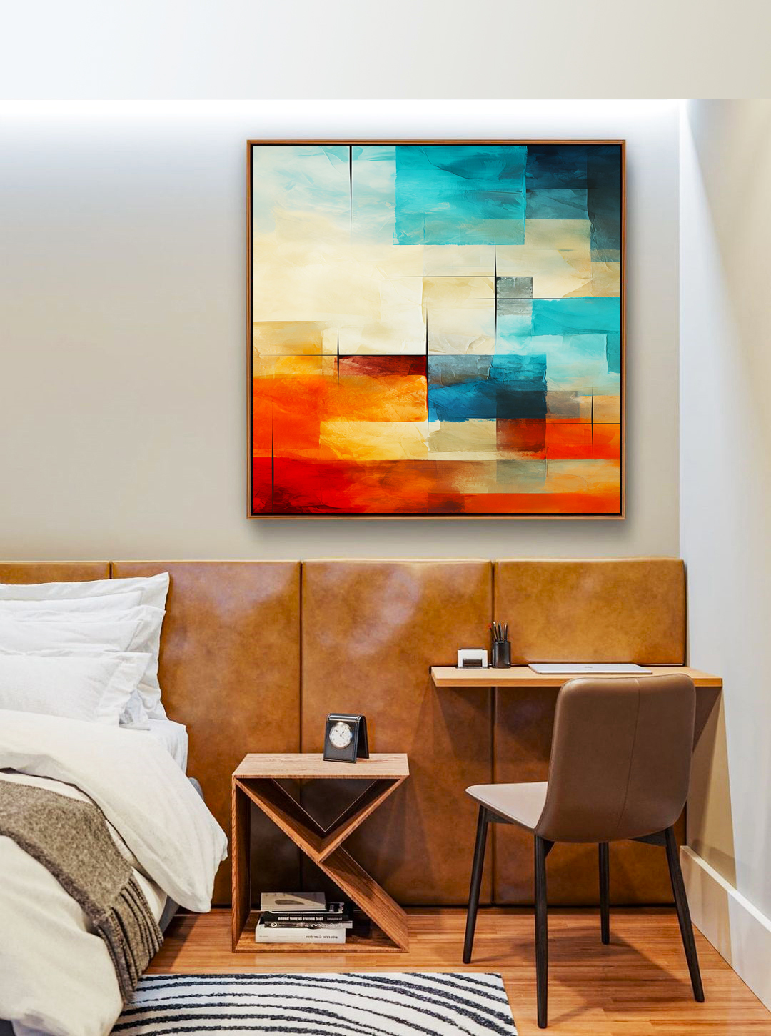 Acrescente elegância ao seu espaço com este Quadro Abstrato Quadrado. O mosaico geométrico em azul, laranja e vermelho destaca-se na decoração. Perfeito para salas, quartos e escritórios, proporcionando um ambiente moderno, sofisticado e cheio de personalidade.