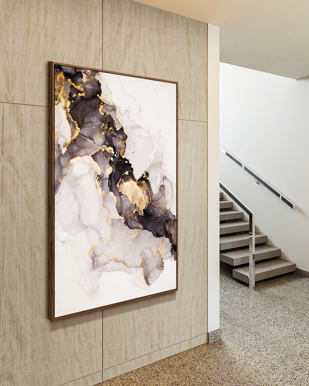 Valorize seu ambiente com este Quadro Abstrato Vertical Sofisticado. A arte fluida em cinza e dourado traz requinte e harmonia ao espaço. Perfeito para salas, escritórios e halls, adicionando um toque contemporâneo à decoração.
