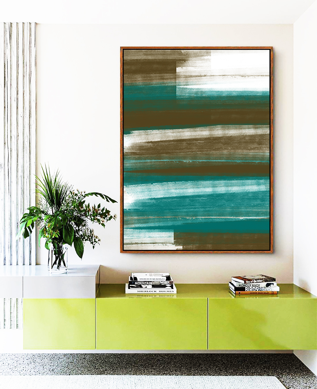 Tons de verde oliva, turquesa e branco formam uma estética abstrata elegante e atual. O contraste suave ilumina o ambiente e transmite tranquilidade, sendo uma excelente escolha para salas, quartos e espaços com proposta clean e sofisticada.