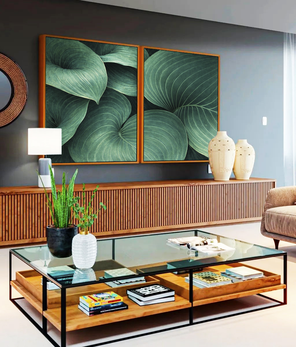 Este Duo de Quadros destaca folhas de Hosta em tons verdes intensos, criando um visual sofisticado e atemporal. Ideal para decorar salas de estar, quartos sofisticados, escritórios elegantes ou halls de entrada com identidade natural.