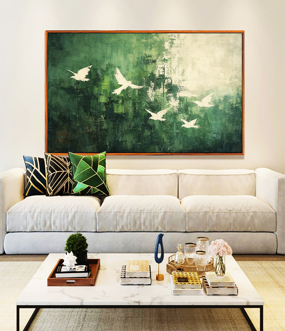 Pássaros voando sobre fundo verde com textura abstrata criam sensação de liberdade, leveza e tranquilidade. Estilo moderno e elegante que valoriza a decoração com suavidade. Perfeito para salas, quartos e escritórios.