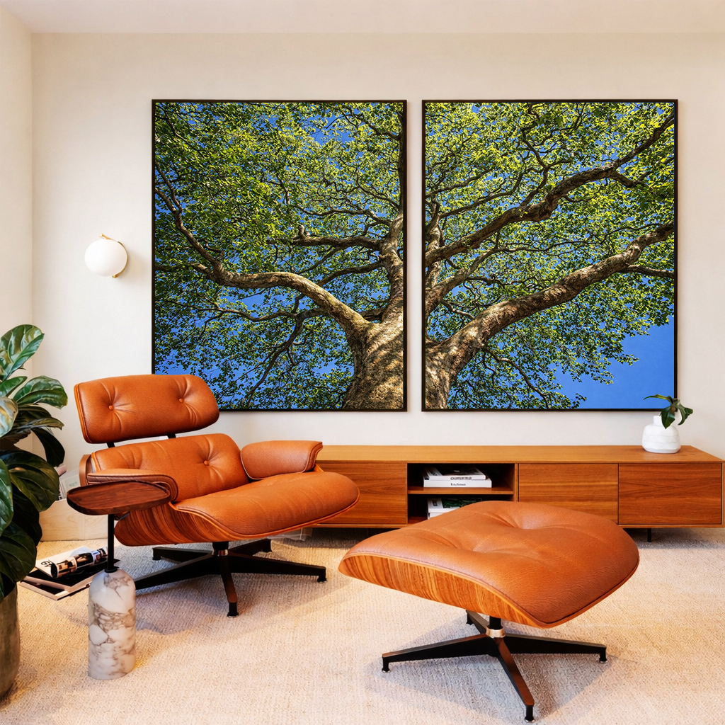 Duo de Quadros Árvore Frondosa Folhas Verdes Contra Céu Azul Canvas Moldura