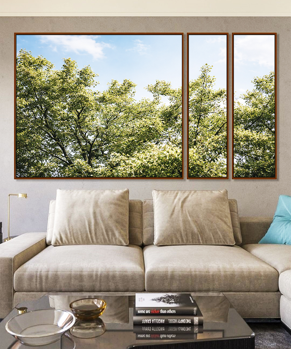 Árvores com folhagem verde sob céu claro com nuvens criam paisagem natural leve e luminosa. Inspiração em natureza, ar livre e tranquilidade que traz frescor à decoração contemporânea. Perfeito para quartos de dormir, salas de estar ou escritórios.