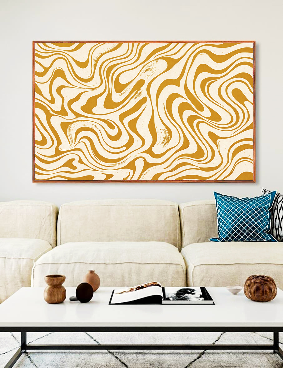 Quadro Horizontal com ondulações orgânicas em amarelo, que transmite modernidade e estilo. Ideal para valorizar salas amplas, halls de entrada refinados ou escritórios, adicionando arte abstrata e elegância ao ambiente.