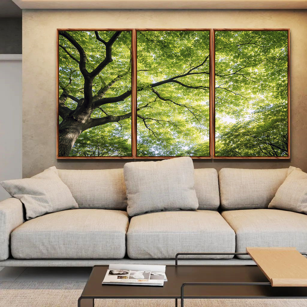 Folhas verdes vibrantes em uma árvore cheia de vida, trazendo frescor e harmonia para o ambiente. Ideal para sala, quarto, escritório ou espaços que pedem um toque natural e acolhedor.