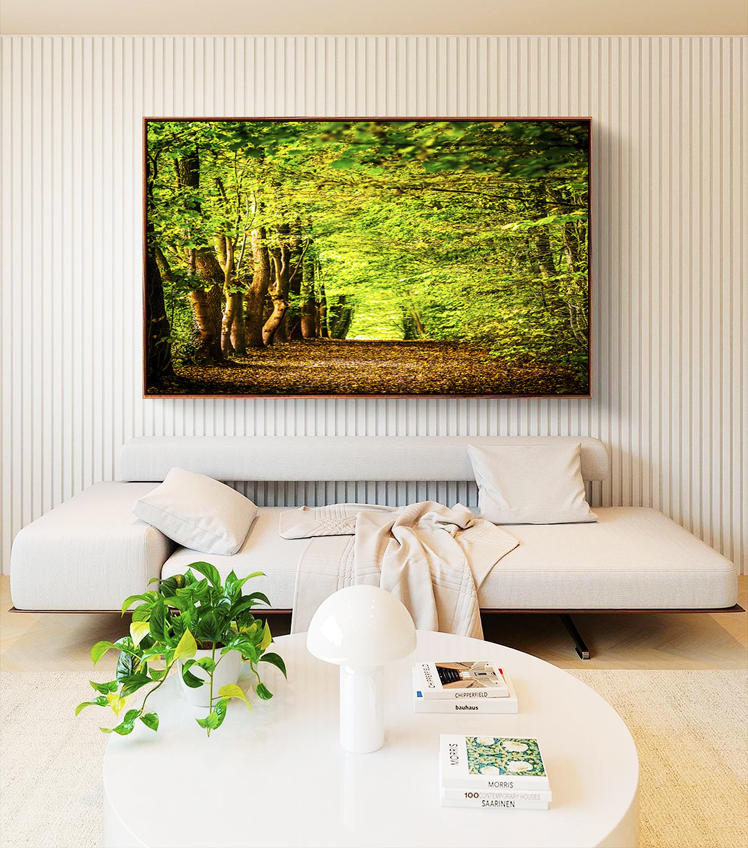 Este Quadro Horizontal transmite calma e conexão com a natureza através de um caminho entre árvores iluminadas. Uma obra perfeita para salas, halls de entrada ou escritórios que valorizam equilíbrio, elegância e beleza natural em cada detalhe.