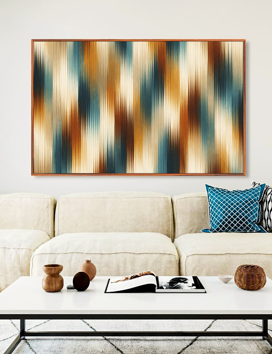 Sutil e envolvente, este Quadro Horizontal com listras azul em degradê e nuance bronze transmite equilíbrio visual e requinte. A escolha certa para salas amplas, quartos elegantes, escritórios criativos ou halls de entrada marcantes.