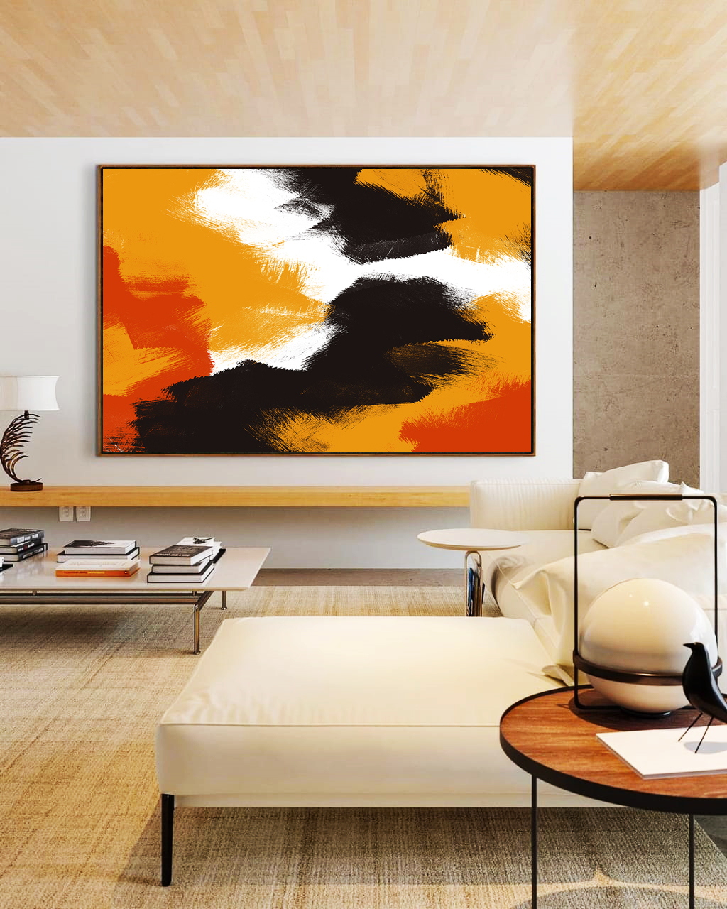 Arte abstrata com paleta quente em amarelo, laranja abóbora e preto, uma arte de pintura moderna e design contemporâneo. Visual marcante que adiciona energia, contraste e elegância à decoração.
