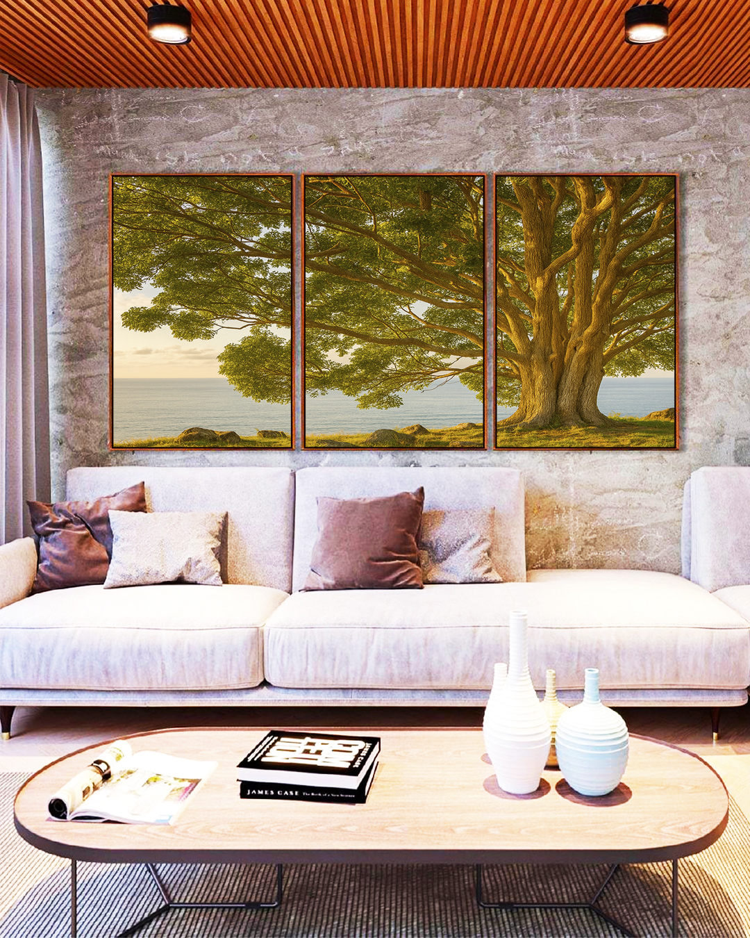 Natural e sofisticado, este Trio de Quadros retrata a harmonia entre árvore, mar e paisagem, criando uma atmosfera leve e elegante. Ideal para valorizar salas refinadas, quartos tranquilos, escritórios modernos ou halls de entrada imponentes.